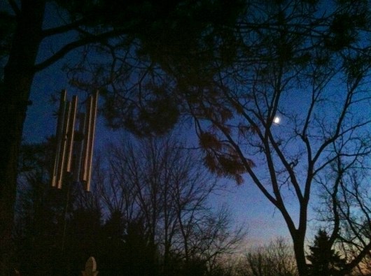 Photo was from 11/17/12 when we were loading lumber into a U-Haul. The windchimes on the left have an inscription to Keith. The moon seemed to be smiling on us as we worked.